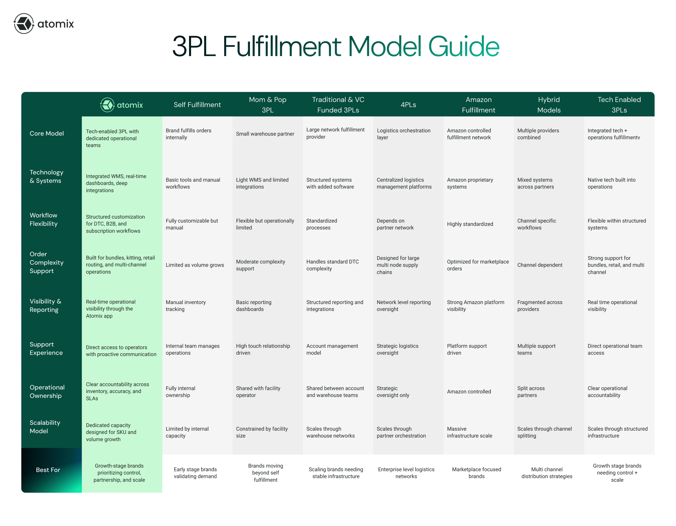 Self fulfillment and mom and pop 3PLs work at early stages. Traditional 3PLs provide scale. 4PLs serve enterprise complexity. Amazon MCF serves marketplace-first brands. Hybrid models serve multi-channel distribution. Tech-enabled 3PLs like Atomix serve the growth-stage brand that needs a real partner, not just a warehouse.