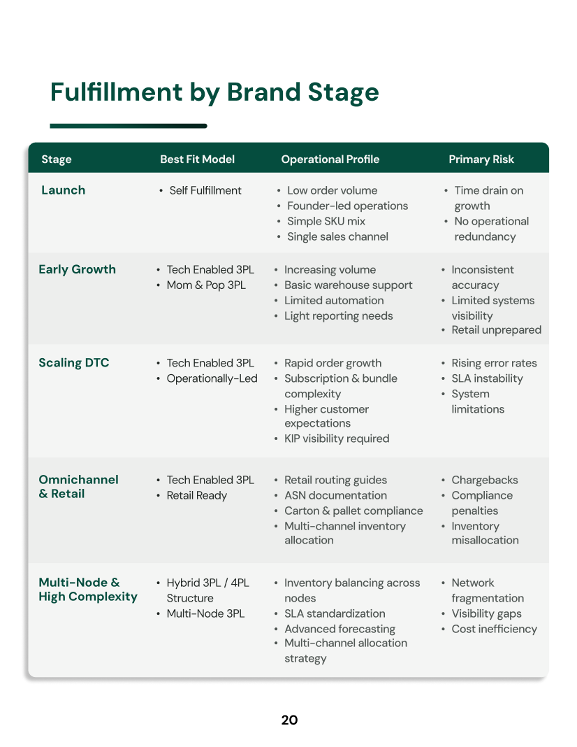 This resource provides a structured look at how fulfillment models evolve as brands grow, from self-fulfillment to multi-node operations.